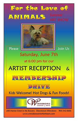 Join us for the opening reception on June 7th of our summer family-friendly exhibit, For the Love of Animals, featuring works of art of our favorite creatures. Art in all mediums will be presented by local artists, as well as student art from local schools. Our reception will be fun for kids with hot dogs, animal crackers, zoo juice, and other 'animal' foods.
