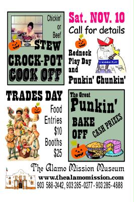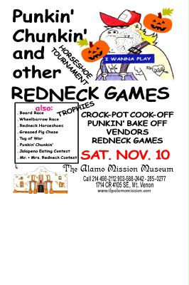 Redneck Play Day, Punkin Chunkin & other redneck games - Horseshoe Tournament - Trades Day - Food entries $10 Booths $25. The Great Punkin Bake Off Cash Prizes